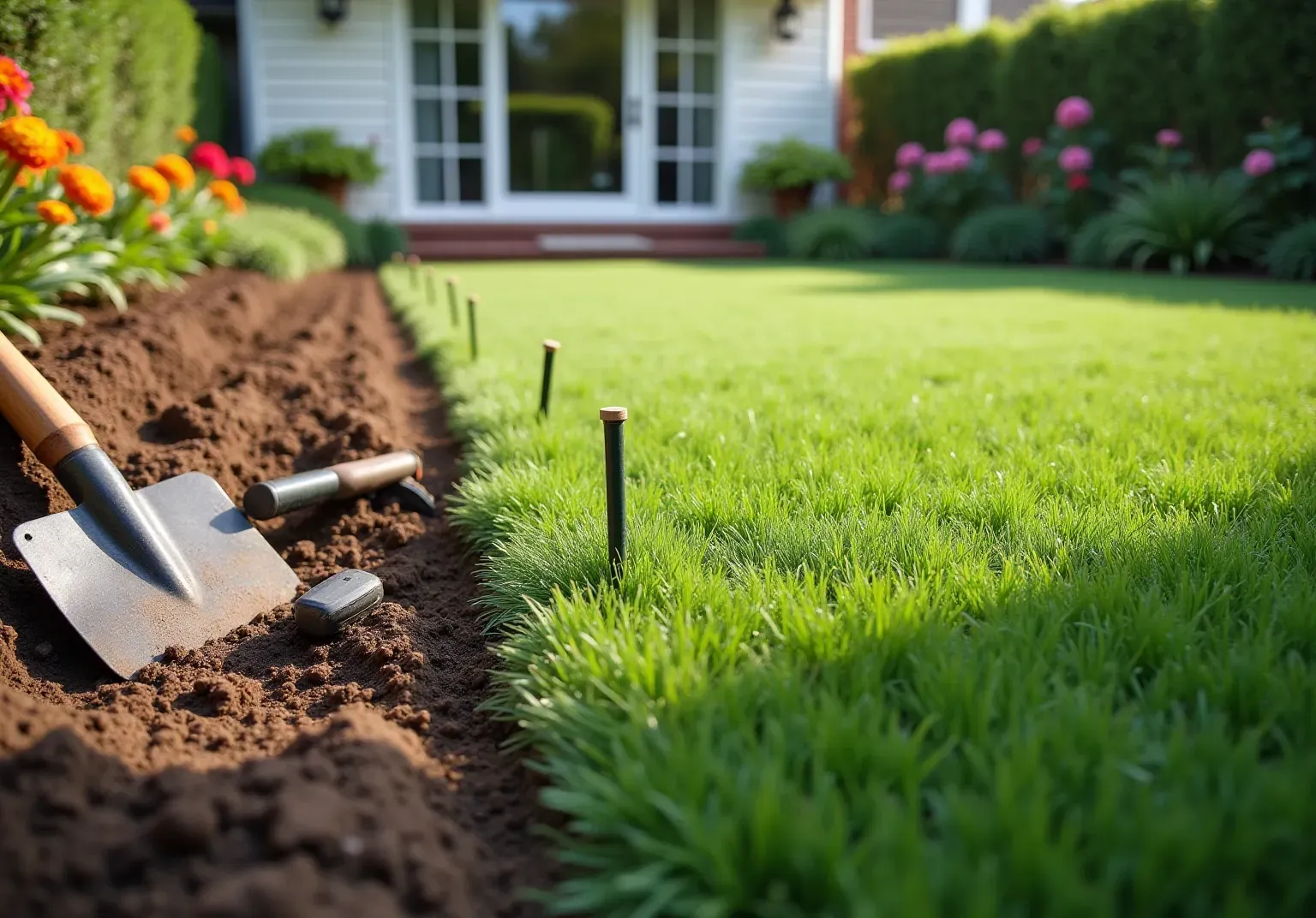 Outline the designated space for the grass using stakes and string to create a visual guide that ensures the grass is laid out accurately.