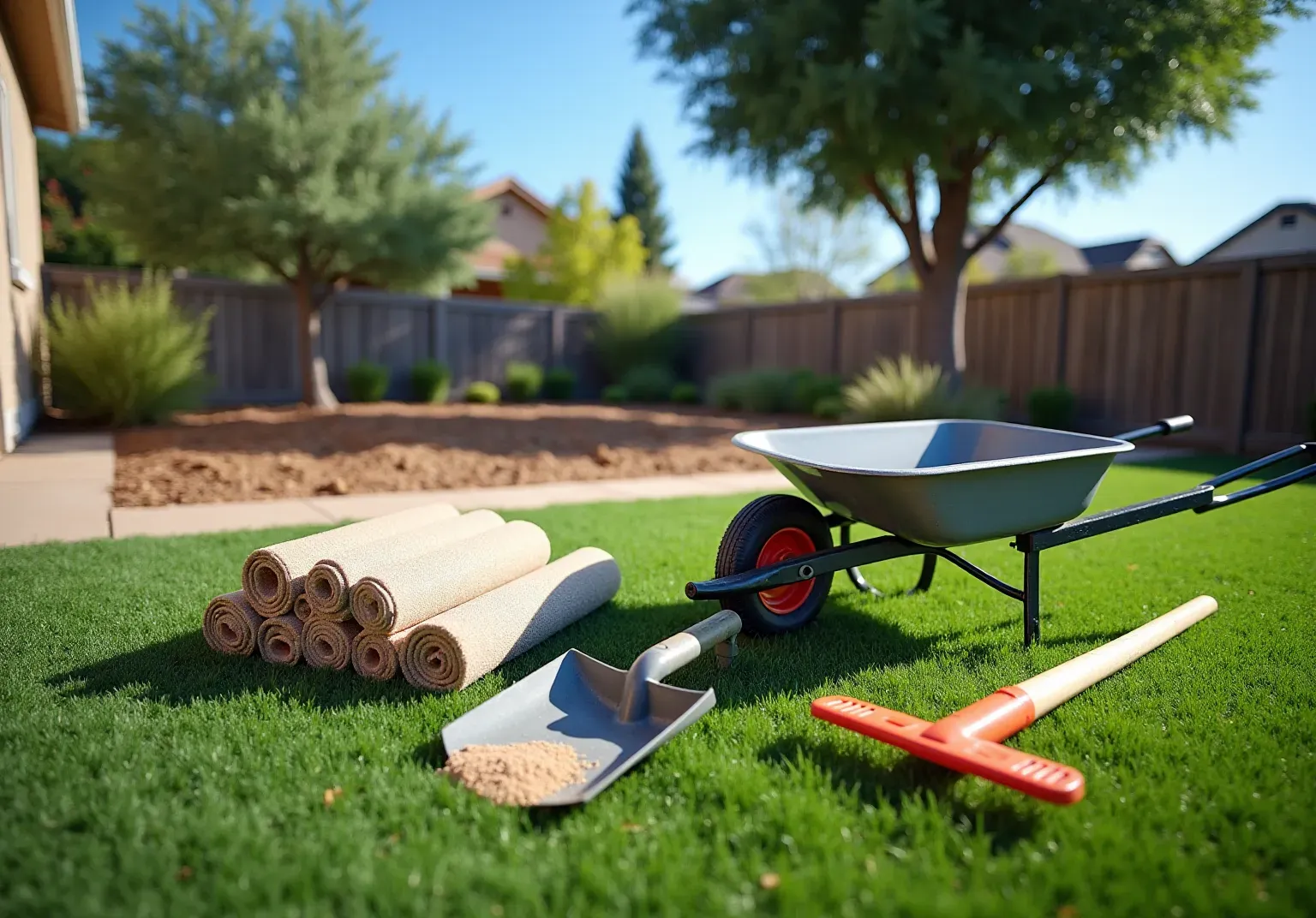 The essential tools required include a shovel, rake, wheelbarrow, plate compactor (or hand tamper), utility knife, measuring tape, turf staples or nails, seam tape (if needed), and bender board (for edging).