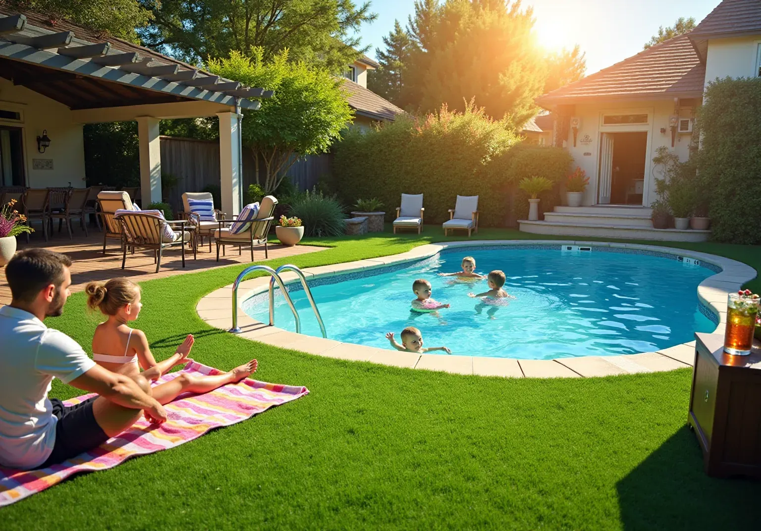 The soft texture of high-quality synthetic grass is comfortable underfoot, enhancing the overall experience for individuals relaxing or playing around the pool area.